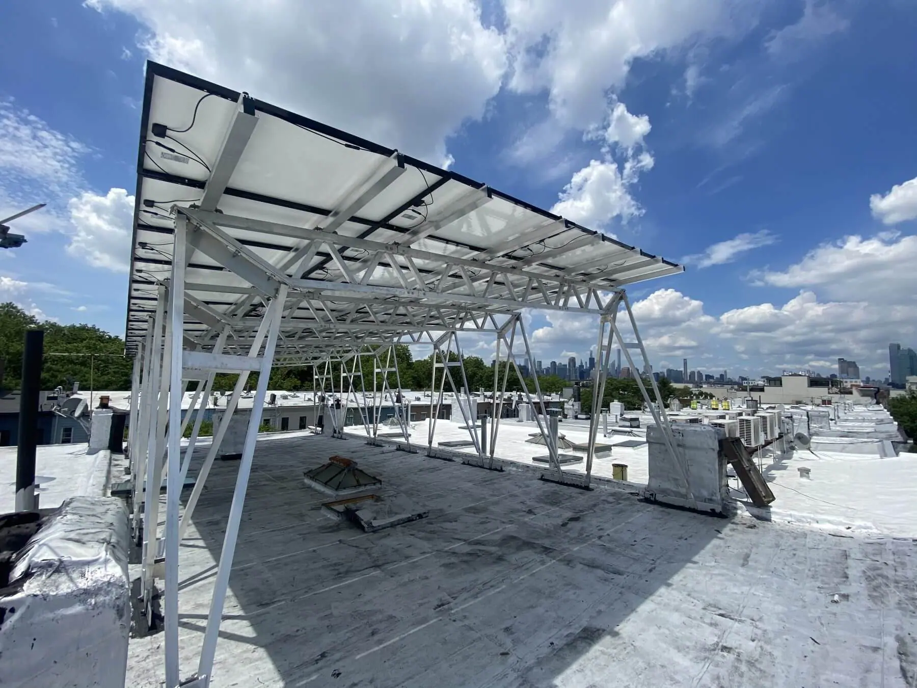 The very first solar system was installed on a rooftop right here in New York City way back in 1884. But for a long time, unfortunately, solar companies avoided installing solar in our urban environment due to its complexities. Conventional solar models were made for the suburban, pitched roof home, unlike many homes here in the city.